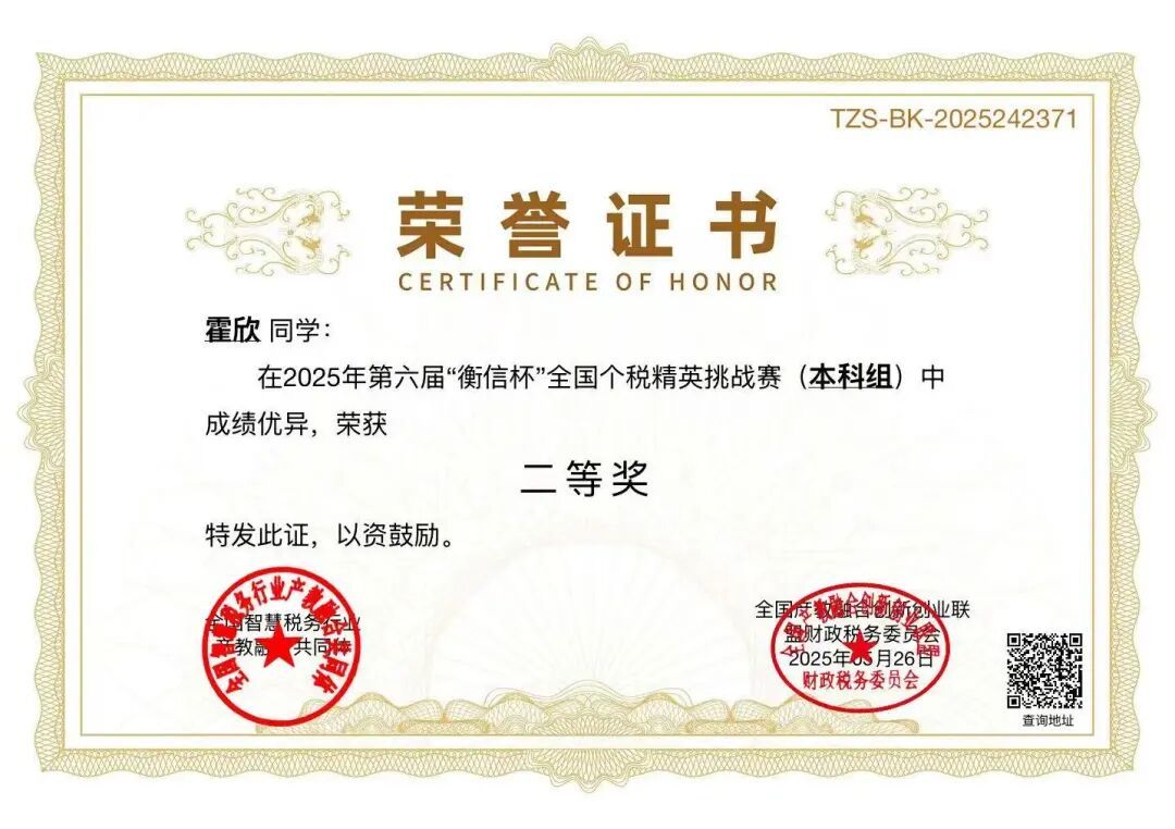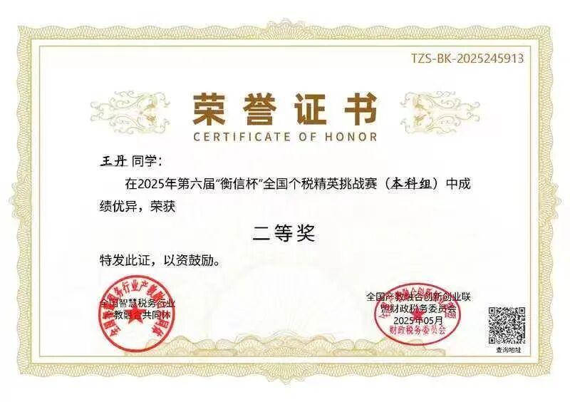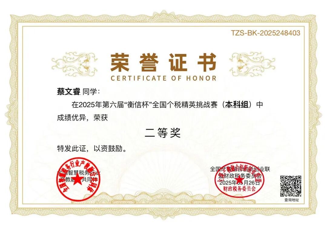 在2025年第六届 “衡信杯” 全国个税精英挑战赛中,学校财务管理专业派出的参赛团队表现亮眼。同学们凭借扎实的个税知识储备、对数电票等实操的熟练运用,在赛场上沉稳应对。最终,获奖率高达 90%,一举拿下国家级团体二等奖,彰显出财务管理专业学生过硬的专业本领与综合素养,这无疑是对学校教学实力与人才培育成效的有力印证。