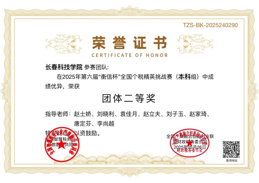 此次比赛以团队赛形式开展,围绕个人所得税、数电票等知识展开激烈比拼。全国共173所本科院校、超12000名选手,长春师范大学、长春财经学院的学子们都踊跃参与。在这场赛事中,学校参赛团队一路过关斩将,凭借扎实知识与默契协作,最终荣获国家级团体二等奖,充分展现了学校财税教学的卓越成果。