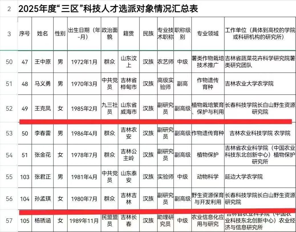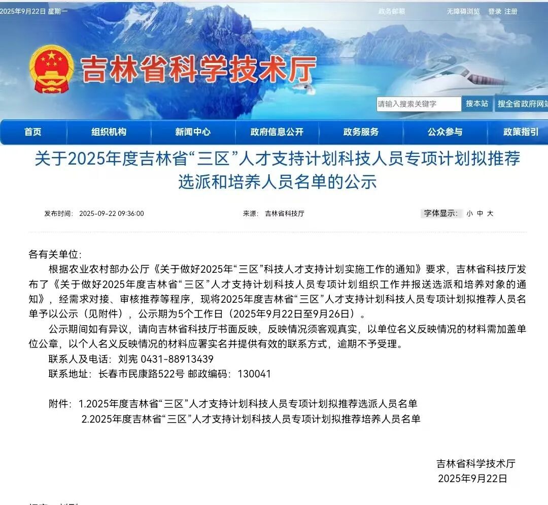 近日,根据农业农村部办公厅《关于做好2025年“三区”科技人才支持计划实施工作的通知》要求,吉林省科技厅发布相关组织工作通知。经严格的需求对接、审核推荐等程序,我校长白山野生资源研究院孙孟琪、王克凤两位老师入选2025年度吉林省“三区”人才支持计划科技人员专项计划拟推荐人员名单。