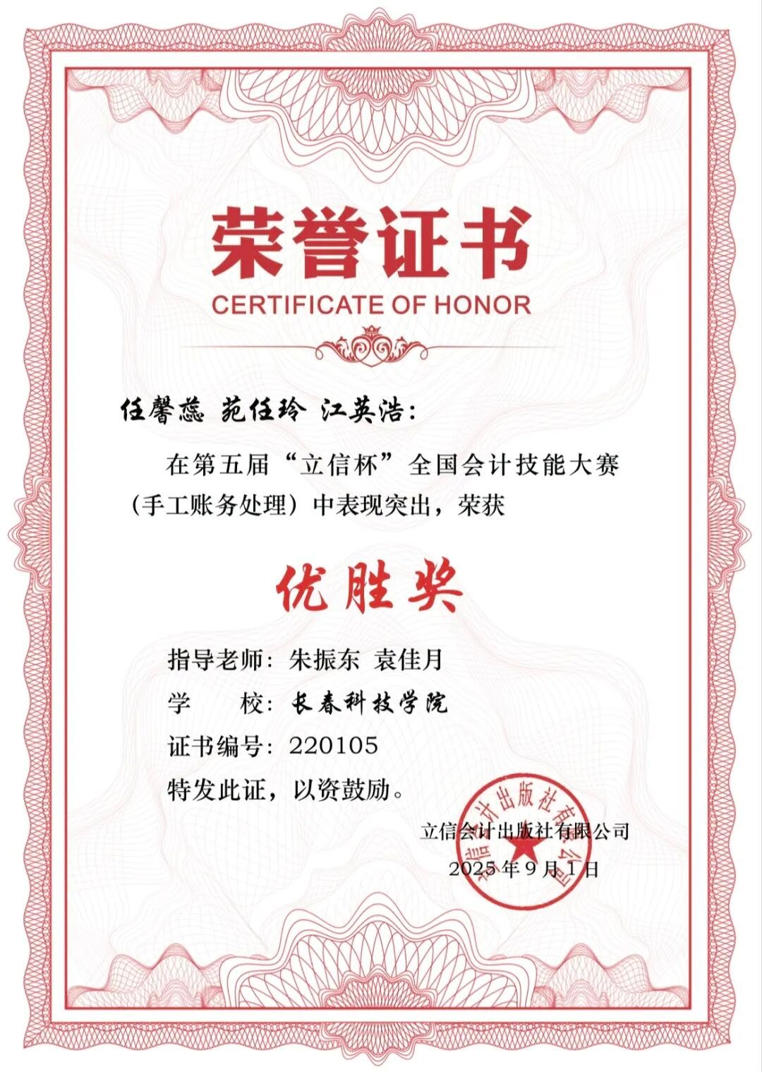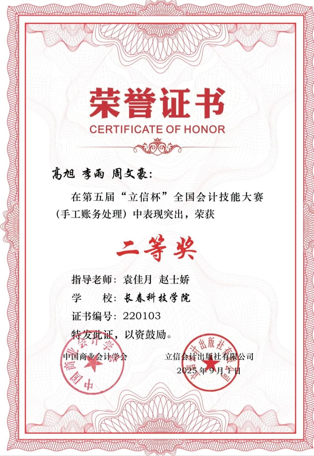 本次大赛聚焦手工账务处理全流程实操能力,以制造业仿真经济业务为背景,考核选手建账、原始单据处理、账簿登记、报表编制与分析等核心技能。赛事吸引全国众多院校参与,长春科技学院组建多支队伍参赛,在赵士娇、朱振东、袁佳月等指导老师的带领下,最终收获累累硕果:
