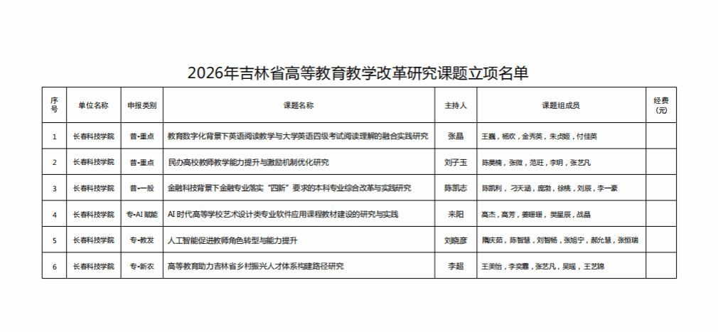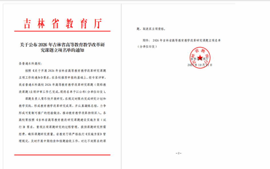 今日,吉林省教育厅公示了2026年吉林省高等教育教学改革研究课题立项名单,学校共获批吉林省高等教育教学改革研究课题6项。其中,张晶和刘子玉老师申报的《教育数字化背景下英语阅读教学与大学英语四级考试阅读理解的融合实践研究》、《民办高校教师教学能力提升与激励机制优化研究》立项为重点课题。