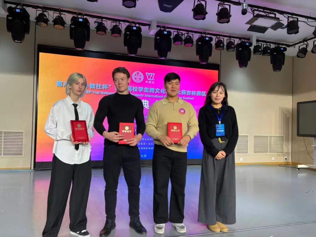 2025年10月26日,第八届“外教社杯”全国高校学生跨文化能力大赛吉林赛区比赛在长春师范大学圆满落幕。在王志刚、杜欣、孙嘉岐老师的共同指导下,学校国际学生团队凭借出色的跨文化案例开发与现场表现,荣获吉林赛区一等奖,展现了卓越的跨文化沟通能力与国际视野。