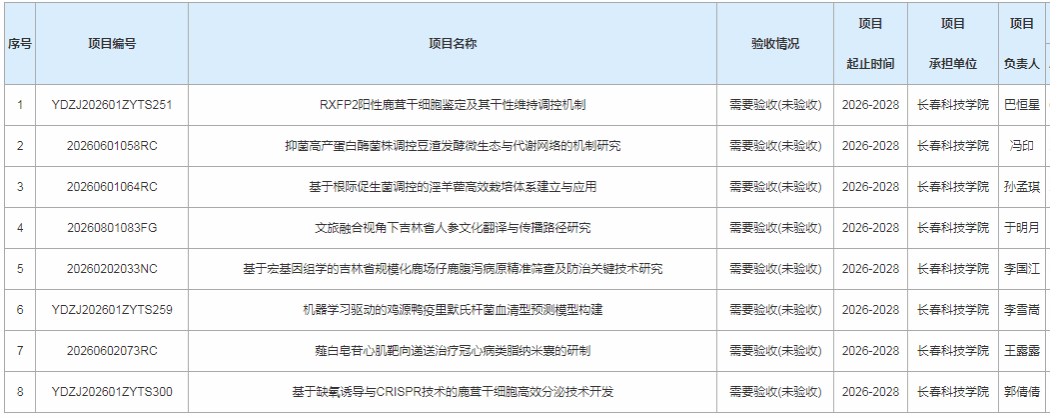 近日,吉林省科技计划项目管理信息系统更新立项项目数据,学校共有9项项目成功立项,其中8项项目为学校自主申报获批,1项项目由学校作为第一参加单位与中国农业科学院特产研究所合作承担,科研经费突破200万元,实现立项数量与经费总量“双突破”,科研竞争力和创新实力持续增强。