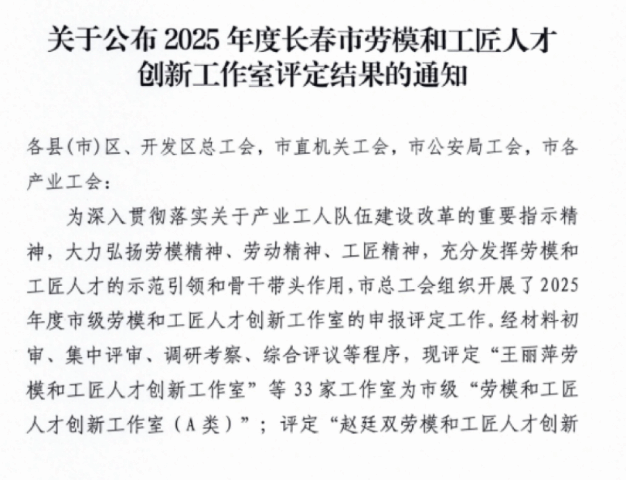 2025 年度长春市劳模和工匠人才创新工作室评定结果通知截图