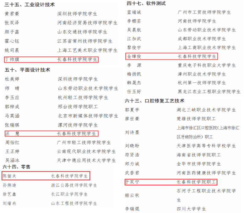 学院选手陈俪夫入围零售项目集训队,丁帅旗入围工业设计技术项目集训队,金璋俊入围软件测试项目集训队,汪慧入围平面设计技术项目集训队,于双宁入围口腔修复工艺技术项目集训队。这些项目覆盖制造与工程技术、信息与通信技术、创意艺术与时尚、社会与个人服务等多个重要领域,既是世界技能大赛的核心竞赛项目,也是当前产业发展急需高技能人才的关键领域。