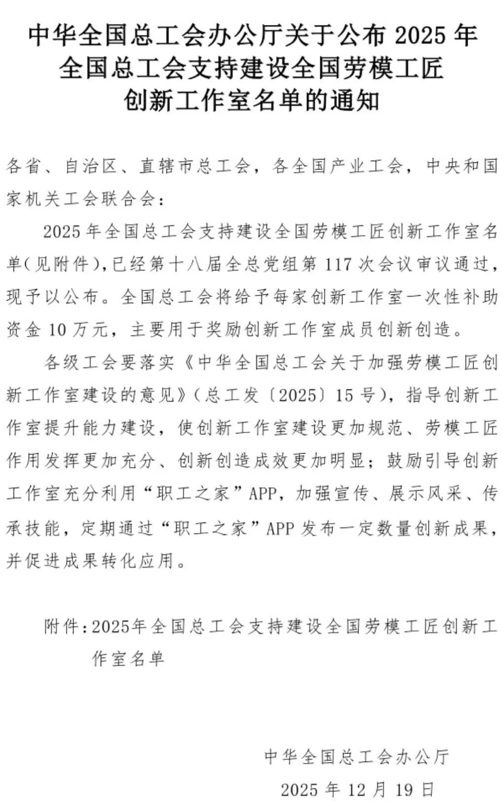 2025 年度全国总工会支持建设全国劳模工匠创新工作室定结果通知截图