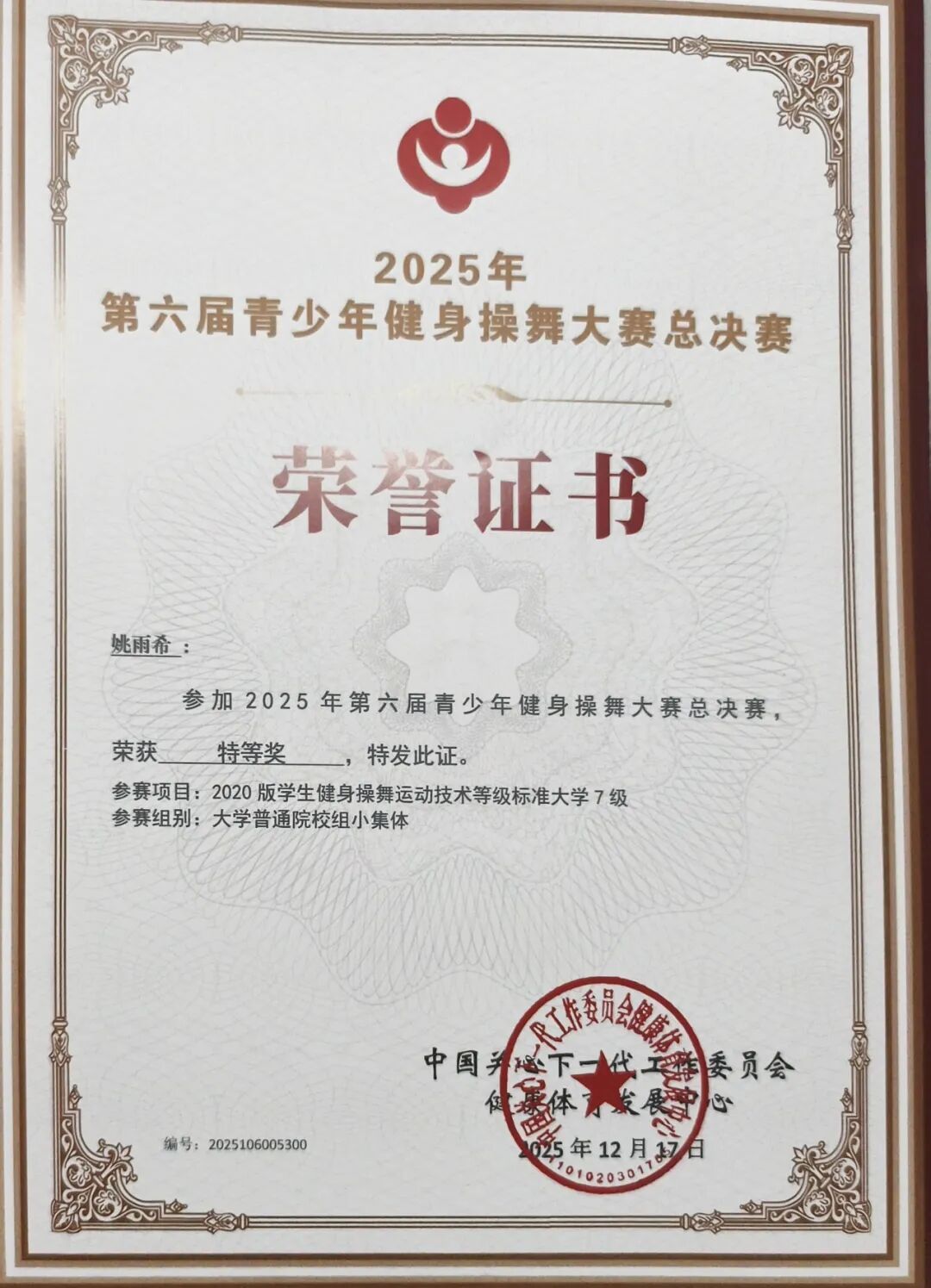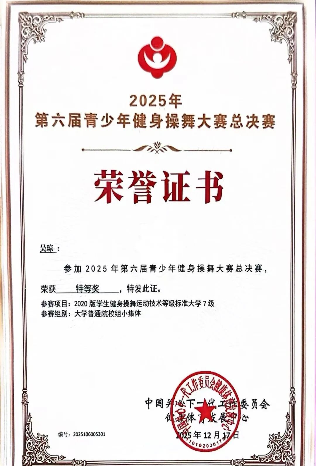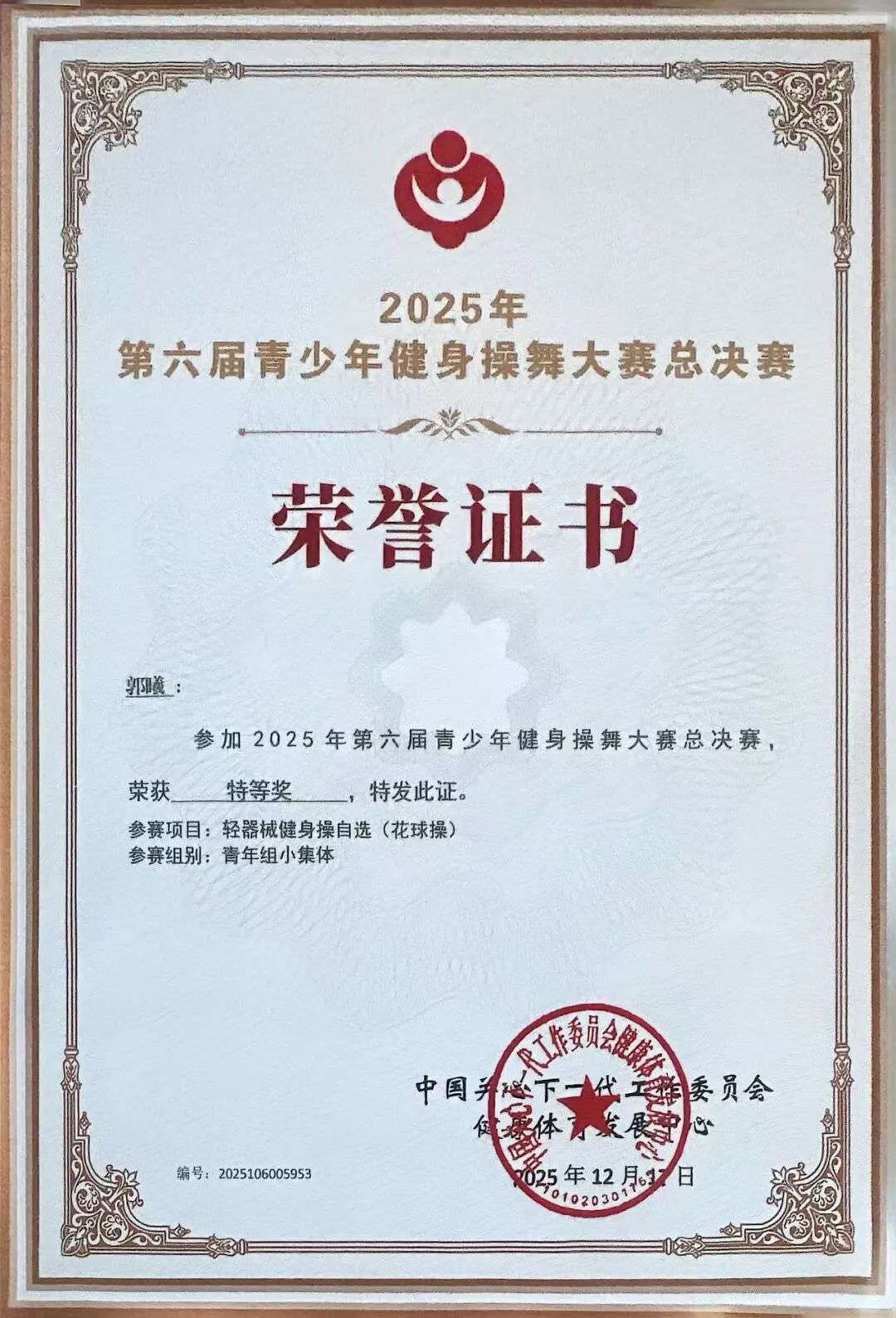 12月17日至12月25日,2025年第六届青少年健身操舞大赛总决赛圆满收官,来自全国20个省市、80个参赛单位的200余支青少年代表队齐聚赛场,以灵动舞姿带来一场场活力满满的精彩展演。学校运动员奋勇拼搏,最终斩获两项特等奖。