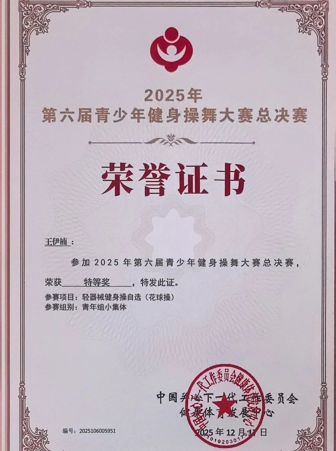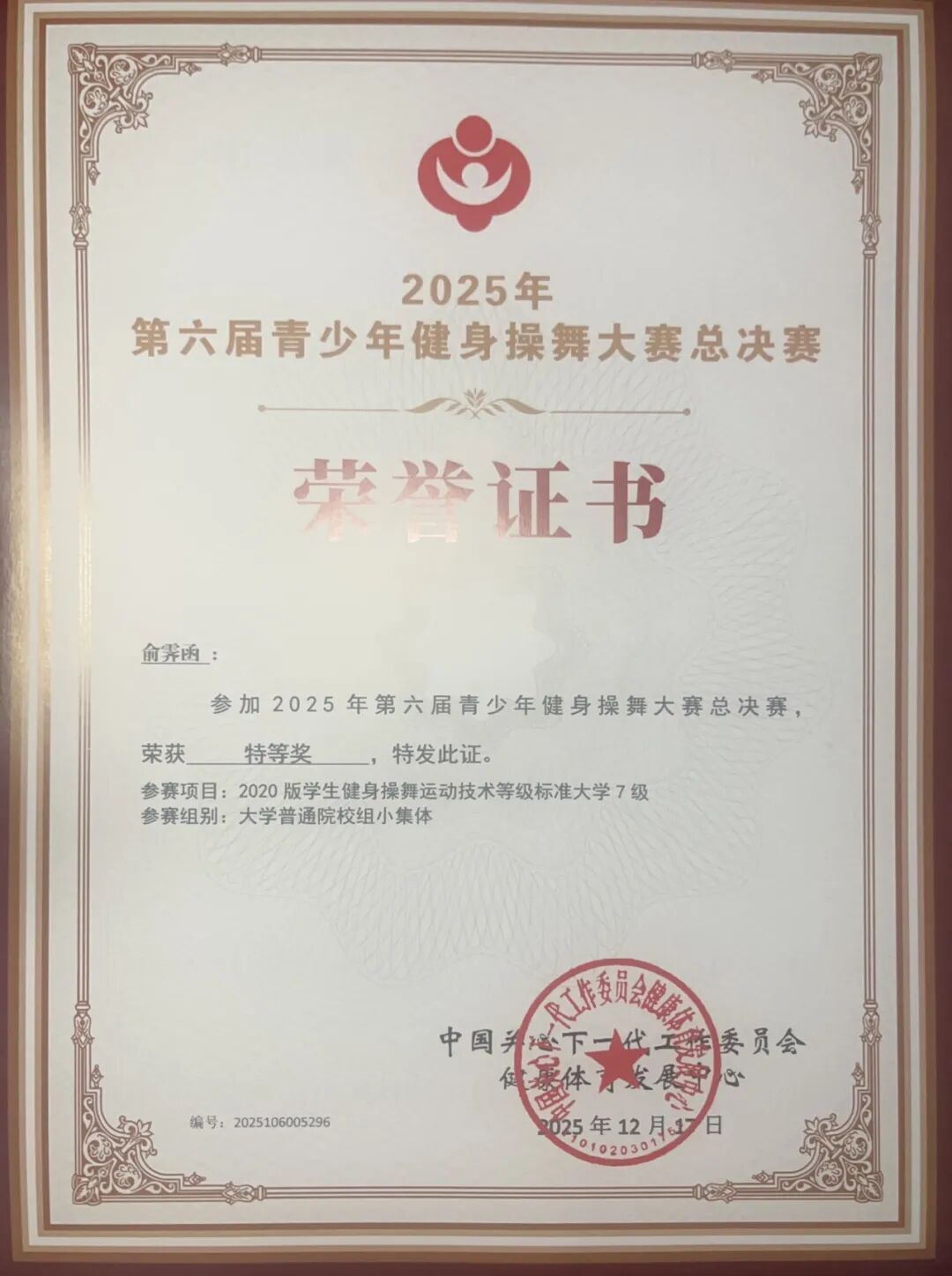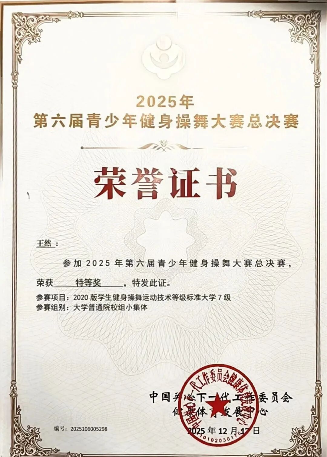 12月17日至12月25日,2025年第六届青少年健身操舞大赛总决赛圆满收官,来自全国20个省市、80个参赛单位的200余支青少年代表队齐聚赛场,以灵动舞姿带来一场场活力满满的精彩展演。学校运动员奋勇拼搏,最终斩获两项特等奖。