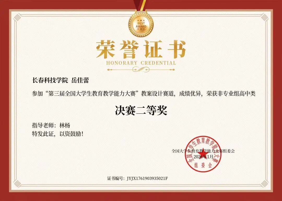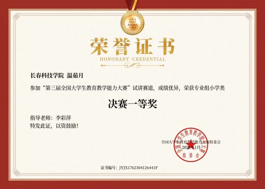 本届大赛聚焦大学生教育教学核心能力的考察,覆盖教学设计、课堂授课、教学反思等多个核心环节,全面检验参赛选手的师范专业素养与实践应用能力。教育与文化传播学院高度重视此次赛事,组织专业教师团队对参赛学子进行系统化指导,从教学设计打磨到课堂模拟演练,全程助力教育与文化传播学院学生提升教学实战能力。参赛学生积极备赛,将教育学理论与教学实践深度融合,以新颖的教学思路、流畅的课堂呈现赢得评委认可,获奖情况如下: