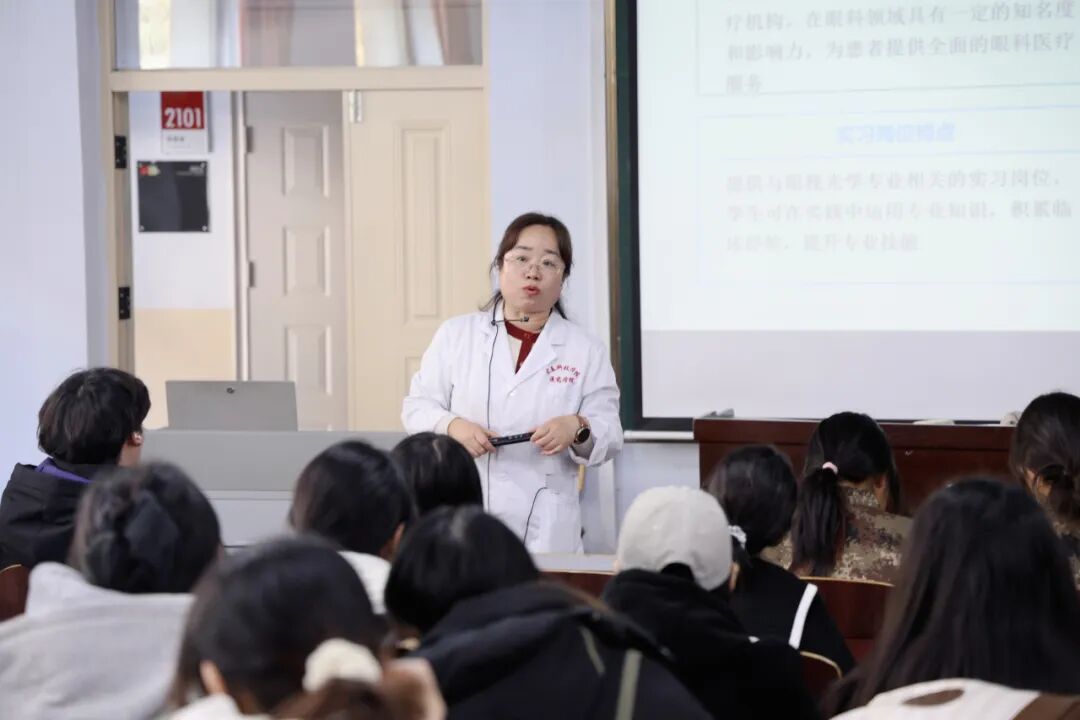 宣讲过程中,王晓晶老师聚焦同学们实习前的核心需求,重点介绍了长春一诺眼科医院、长春爱尔眼科医院、长春易视顿眼科医院等合作医院的情况:既提及各医院的特色诊疗领域与设备优势,也明确了为同学们开放的视光助理、验光、近视防控等实习岗位方向,帮助大家清晰不同单位的适配性,为选择实习单位提供依据。