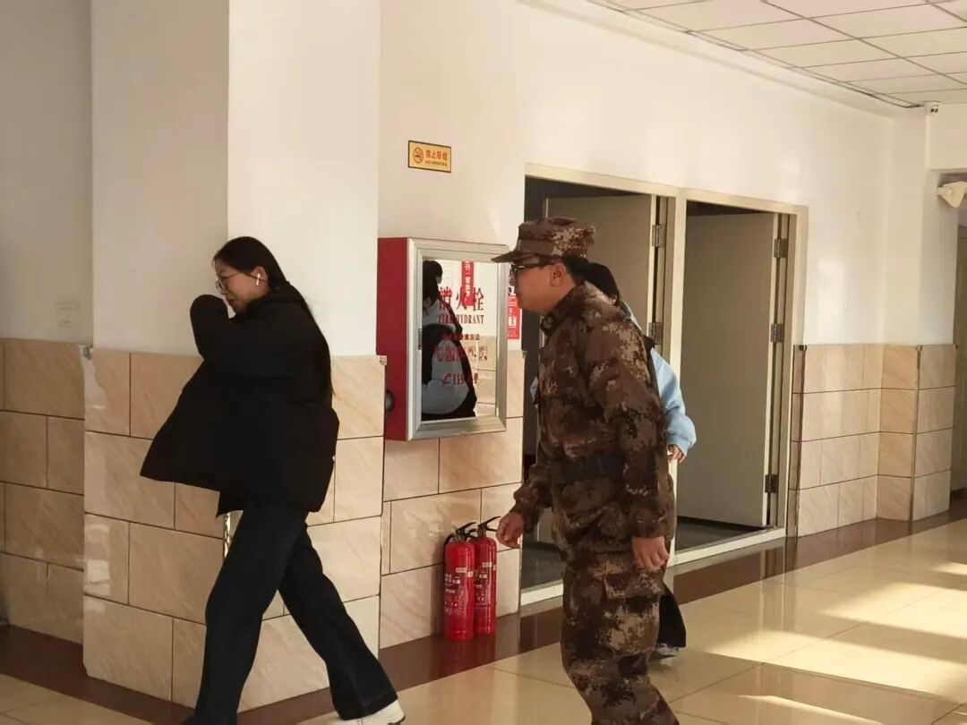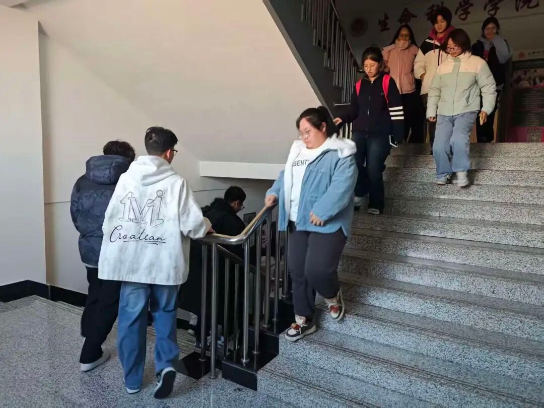 上午11时20分,模拟火灾警报声响起,教学楼内“火情”突发,应急响应机制瞬间启动。师生闻令而动,严格按照演练预案迅速行动:学生们放下手中书本,立即用湿毛巾捂住口鼻,弯腰低姿,在学生干部的带领下有序撤离;预备役教官在楼梯口、岔路口等关键节点全程值守,实时引导疏散方向,及时纠正个别学生奔跑、拥挤等不规范行为,提醒大家保持安全间距,避免发生踩踏事故。整个疏散过程紧张有序、衔接顺畅,师生沉着冷静、配合默契,圆满完成疏散任务。