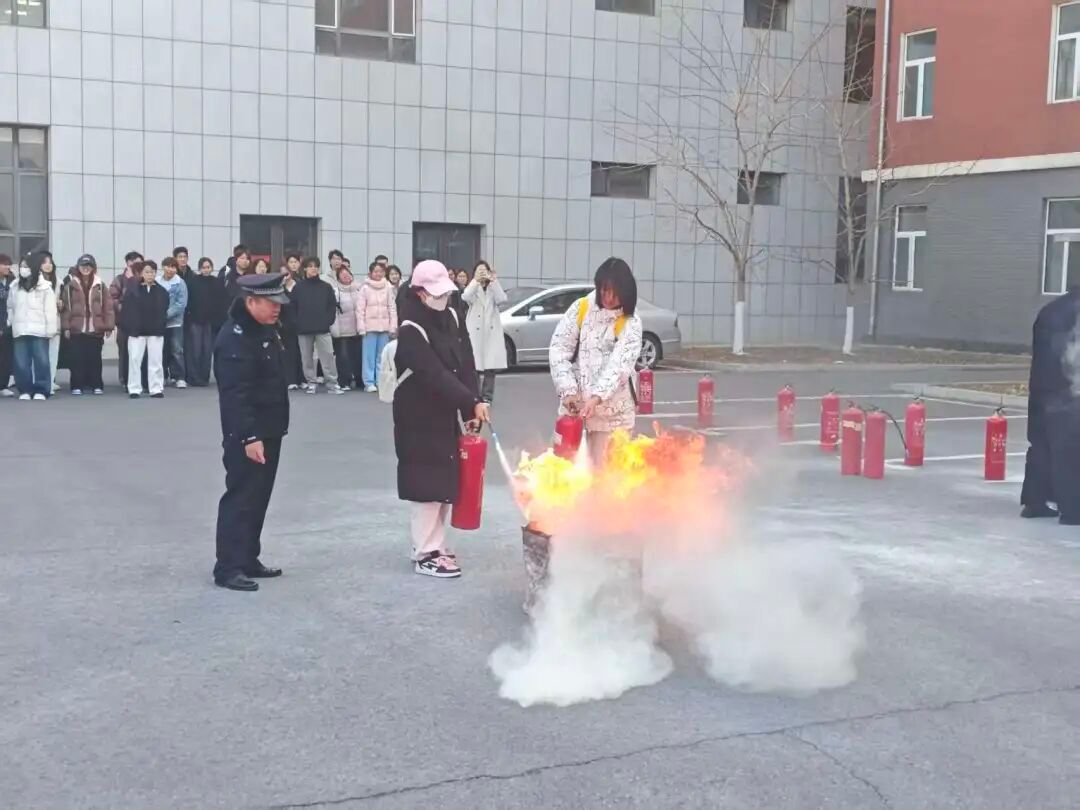 疏散集结后,保卫处老师结合校园火灾特点,开展消防安全知识现场教学。通过通俗易懂的语言,详细讲解火灾成因、初期火灾扑救方法、火场逃生技巧及消防安全注意事项,重点演示干粉灭火器“提瓶体、拔保险、握喷管、压手柄”的规范操作步骤,并强调操作过程中的安全要点。为确保教学实效,活动邀请学生代表上台实操演练,保卫处老师手把手指导,逐一纠正动作偏差,帮助学生熟练掌握灭火器使用技能,真正实现“学以致用”。