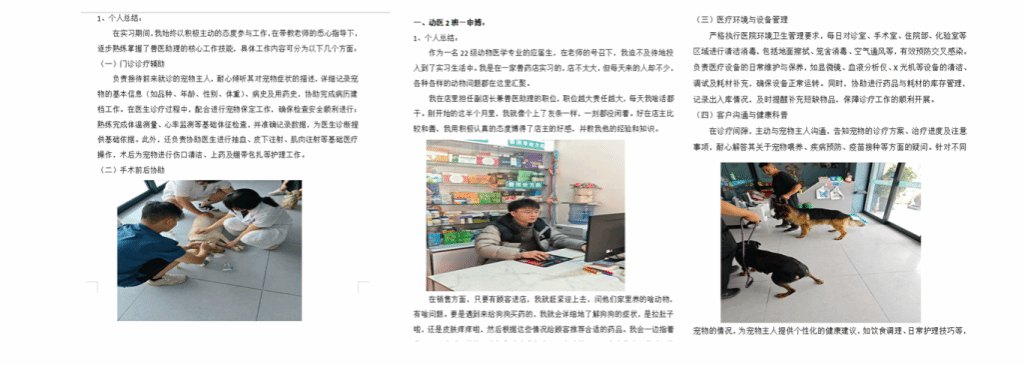 同时,搭建线上交流平台,通过微信沟通及时解答学生在实习中遇到的技术难题与心理困惑。此外,专业还推行实习心得分享与照片打卡制度,学生定期梳理实习收获、分享案例感悟,指导老师则结合分享内容进行点评,引导学生将理论知识与实践应用深度融合。“这周的最后一天重复前几天的工作,器械差不多记全了,问诊和护理流程摸熟了、老师说下周开始学习样本采集,希望下周会做得更好。”一位在动物医学院实习的学生说道。