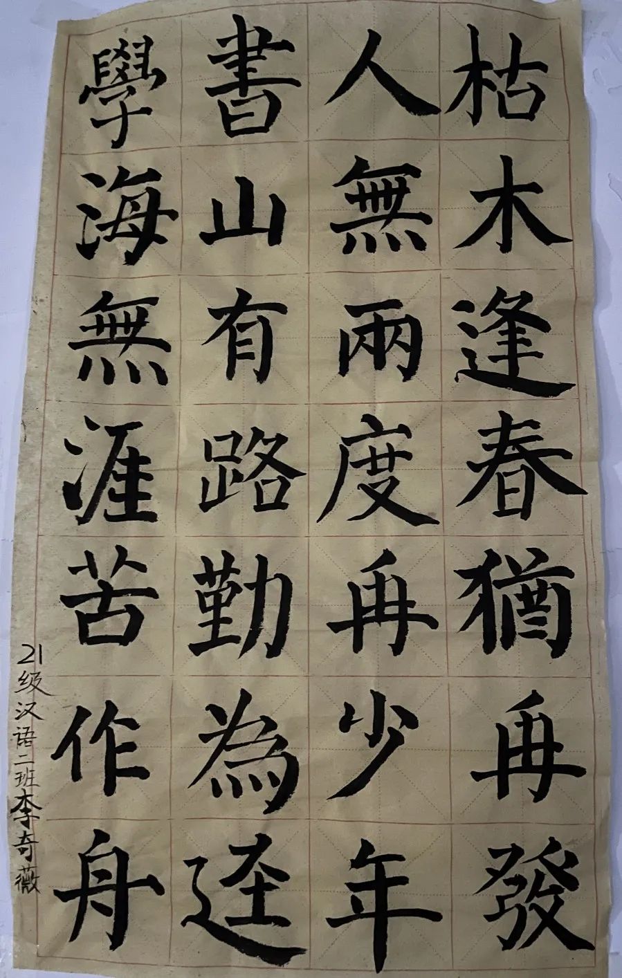 此次比赛以班级为单位,由2021级和2022级汉语国际教育专业全体学生自行选择参赛书法作品,内容以临摹诗歌碑帖为主。比赛现场,学生们个个满怀激情,用心书写每一个笔画、每一个汉字,他们坐姿端正,握笔正确,展示出良好的书写习惯。学生们所写的作品笔画流畅、结构匀称、整体美观,横竖撇捺之中,饱含着良苦用心,行云流水之间,书写着青春风采。