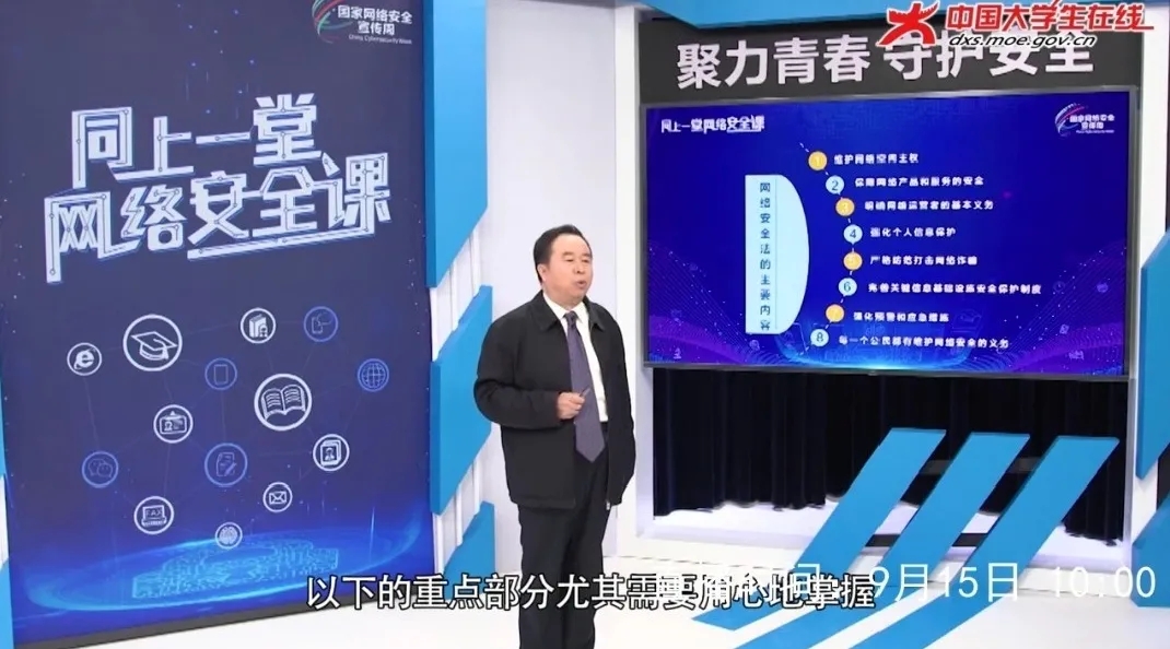 当日,我校广大师生纷纷通过新华网、央视频、腾讯新闻、哔哩哔哩、快手、新浪微博、中国大学生在线等收看在线直播。天津大学法学院院长、中国法学会常务理事、中国行为法学会副会长孙佑海,全国高校辅导员年度人物、华中农业大学理学院党委副书记祝鑫,腾讯守护者计划安全专家张丹作为主讲嘉宾,分别从国家网络安全法律法规以及常见的校园网络安全问题进行剖析,以专家授课演讲的形式面向全国高校师生普及安全知识,探索“网络安全进校园”的新思路和新途径。
