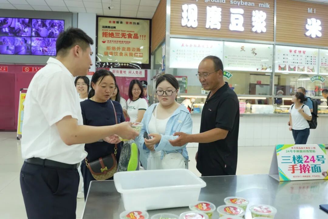 “免费提供打卤面……”食堂经理吴立忠热情的向就餐的新生和家长打着招呼。他表示,为保障活动顺利开展,食堂提前做了周密准备:严格筛选新鲜食材,确保食品安全;开展专项培训,提升员工服务礼仪与现场秩序维护能力;优化场地布置,营造温馨就餐氛围。