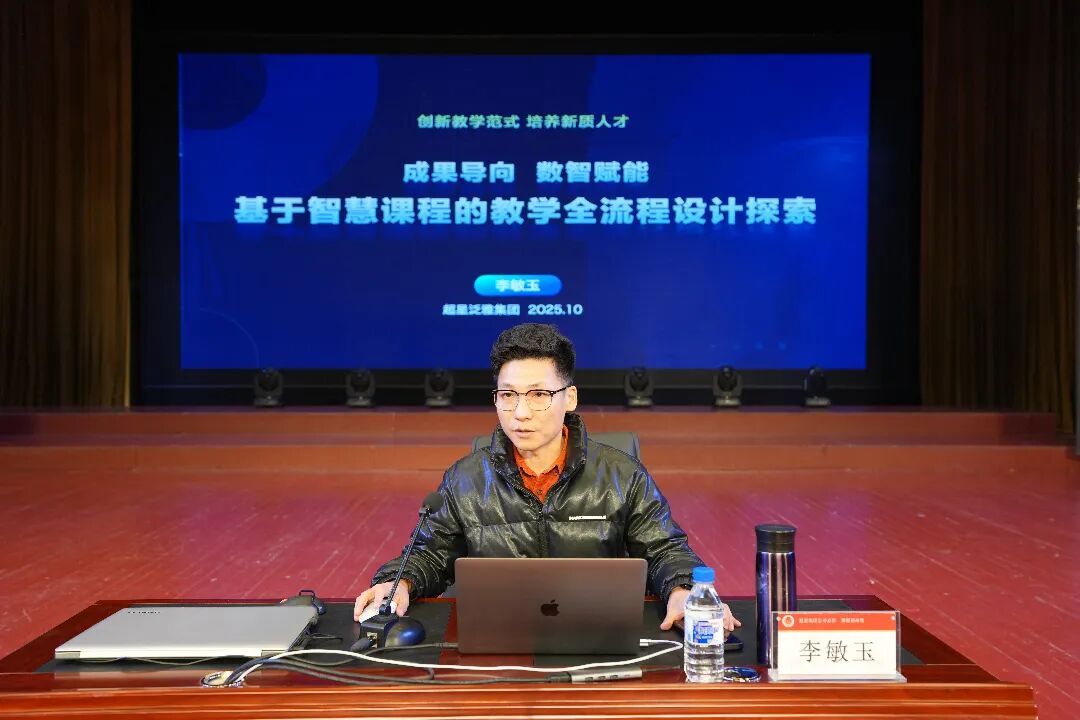 培训分为两阶段进行。第一阶段由超星集团高级教学设计师李敏玉经理,以“基于智慧课程的教学全流程设计探索”为主题展开讲解。拥有13年高校教学积淀的李敏玉经理,结合协助200余所学校100 余门课程获评国家级、省级一流课程的实战经验,从课程目标拆解、资源整合策略、教学互动设计到效果评估方法,通过大量真实案例,以具体实操演示为主,为现场参会人员破解了智慧课程“设计难、操作难、落地难、出成果难”的核心痛点,搭建起智慧课程建设的“基础框架”。