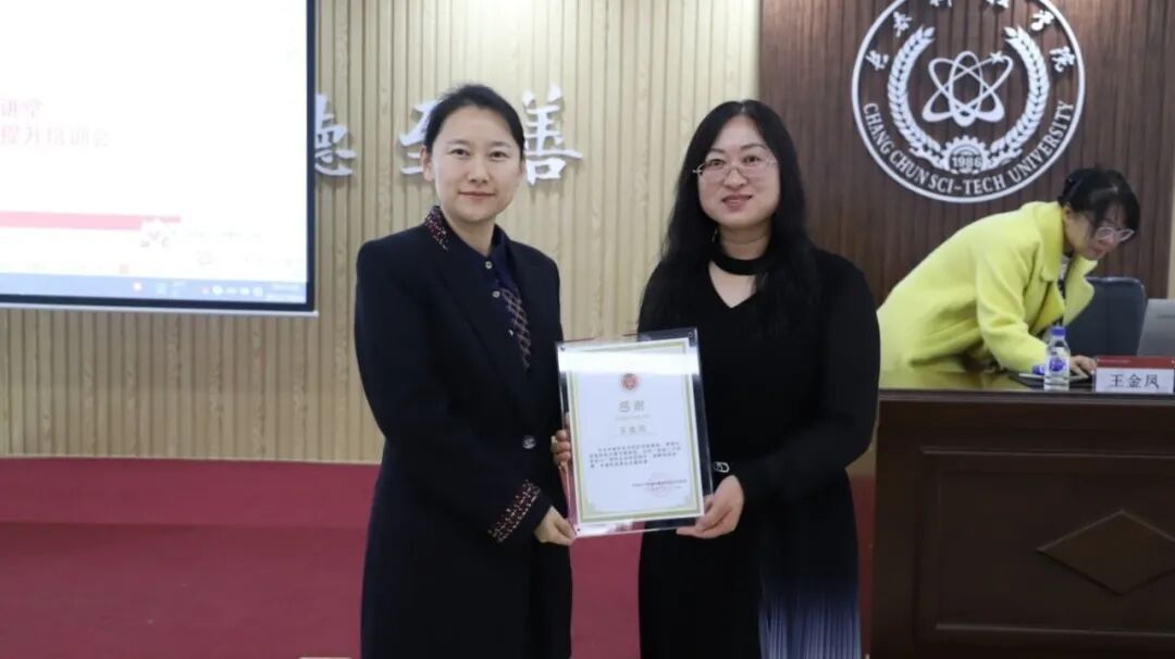 辅导报告后,随即举行感谢牌赠送仪式,党委副书记高芳为王金凤教授赠送感谢牌,以感谢她为此次培训带来的专业指导与精彩分享。