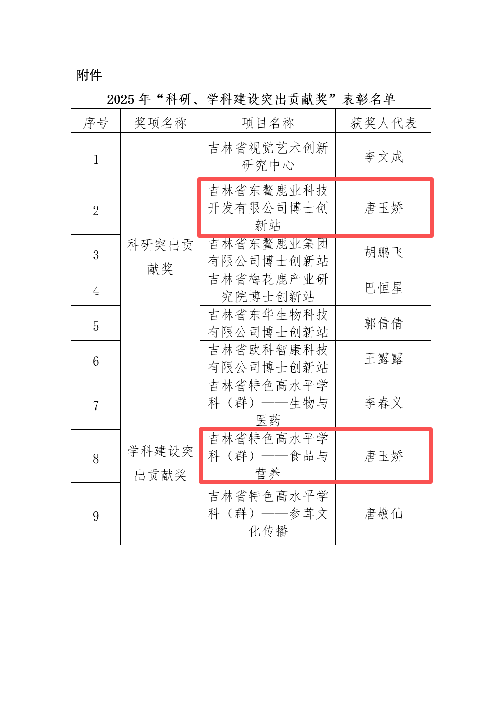 由唐玉娇博士领衔建设的“吉林省东鳌鹿业科技开发有限公司博士创新站”,成功入选吉林省首批 27 个博士创新站典型案例,成为我省鹿产业科技创新的重要样板。唐玉娇博士被聘为 2025 年度吉林省博士创新站宣讲团成员。此外,中国农技协吉林双阳鹿科技小院在 2025 年度评价中获评 “五星科技小院”,充分彰显了研究院在服务产业、服务基层中的示范引领作用。