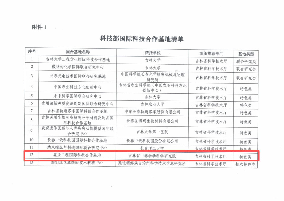 研究院依托鹿产业长期积累的科研基础,经中华人民共和国科学技术部清理规范及重新认定,正式获评“鹿业工程国际科技合作基地”。该平台的认定,标志着研究院在鹿业领域的国际科技协作能力与科研组织水平获得国家层面认可,为持续深化中韩及多国合作奠定了坚实基础。