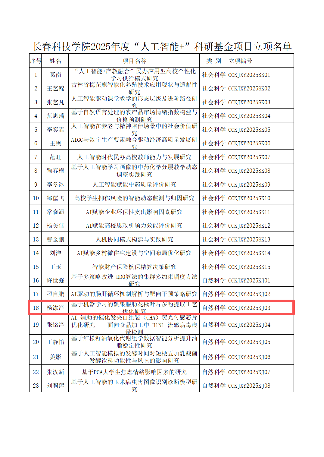 围绕人工智能赋能传统产业、功能食品与精准营养等方向,研究院教师在国家级、省部级科研项目申报中捷报频传。唐玉娇教授成功获批教育部及部级重点实验室课题,刘畅、贾新傲、杨添泽等教师分别获批教育部、省级和校级科研项目,研究院科研体系呈现出多点开花、梯次推进的良好态势。