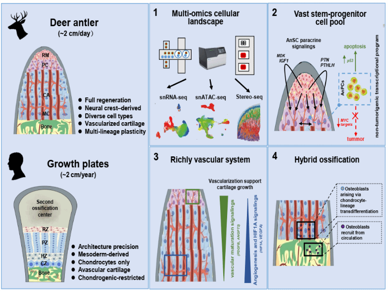 学校鹿茸科学与产品技术研究所李春义教授、巴恒星教授团队在鹿茸生长机制研究领域取得突破性进展,成果于12月在中国科学院双一区Top期刊《iMeta》发表。该研究首次在单细胞和分子水平揭示鹿茸每日厘米级骨生长的核心机制,构建了最完整的鹿茸生长中心单细胞图谱,为人体骨组织快速再生修复研究提供了重要科学启示,彰显了学校在特色基础研究领域的国际影响力。