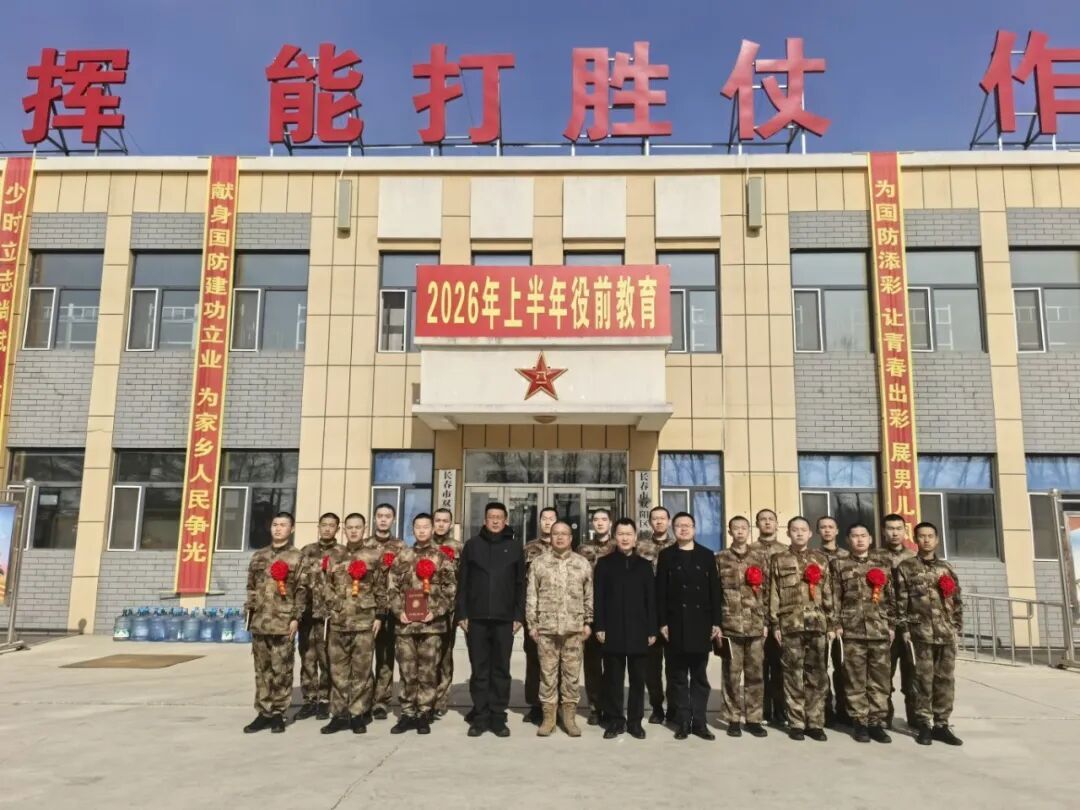 3月14日上午,长春市双阳区武装部征兵基地内气氛庄重热烈,学校2026年春季大学生新兵入伍欢送活动顺利举行。又一批长科学子身着戎装、整装待发,即将肩负使命、奔赴军营,开启保家卫国的光荣征程。校党委副书记宋学山、职业技术学院党总支副书记副院长王东红、国防教育科科长曾建共同出席活动,为即将启程的新兵壮行送行、鼓劲加油。