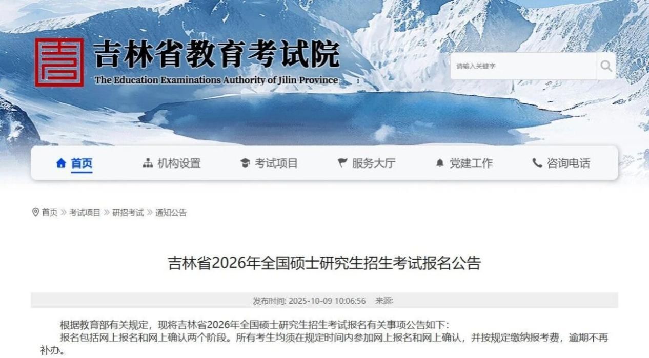 根据教育部有关规定,现将吉林省2026年全国硕士研究生招生考试报名有关事项公告如下: