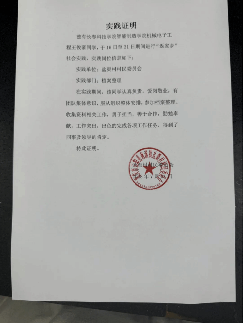 当实践结束的钟声敲响,回望这半个多月的旅程,我双手所及,不仅是纸张的归置与数据的流转,更是盐渠村一段段具体而微的历史从尘封走向新生。档案的电子化,本质上是在为乡村搭建一座数字化的记忆宫殿,让散落的时光碎片得以重组,让模糊的集体记忆重获清晰的轮廓。那些扫描仪下复活的文字与数据,在虚拟空间里重新扎根,继续生长为村庄未来治理的智慧根系。