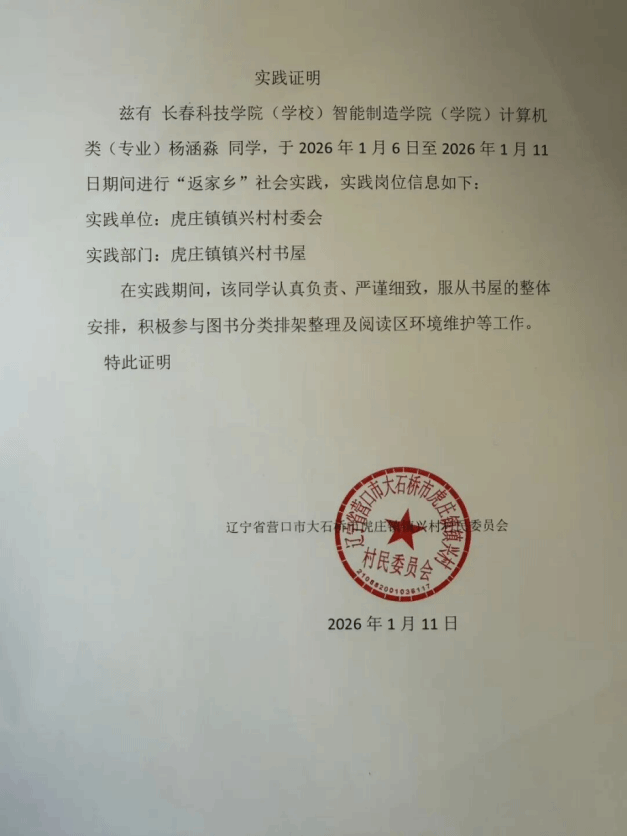 情暖寒岁添暖意,青春践行显担当!为扎根基层沃土,书写青春华章,智能制造学院积极响应号召,组织学子参与2026年寒假“返家乡”社会实践活动,躬身实践、传递温情、不负韶华。