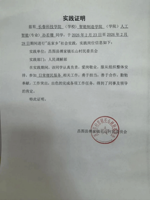 这个寒假,我积极响应学校“返家乡”社会实践号召,来到昌图县傅家镇长山村民委员会,在便民服务岗位上参与基层工作,以青春力量服务家乡群众。这段扎根乡村、贴近民生的经历,让我走出校园、深入基层,在实践中受教育、长才干、作贡献,收获了成长与感动。